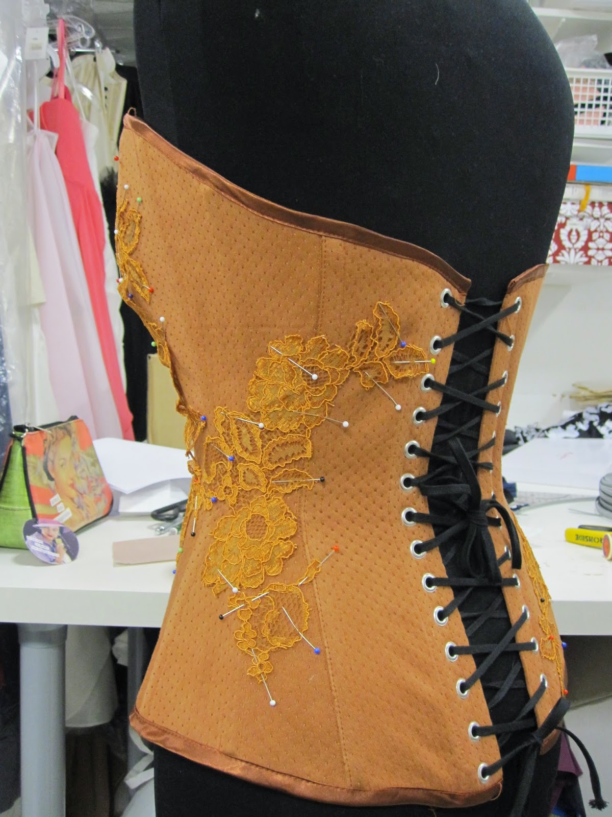 Korsetti on mielestäni aina ollut sellaisenaan, aivan perusleikkauksiltaankin erittäin kaunis vaatekappale. Näyttävät raamit eivät kuitenkaan riitä, joten lähdin hahmottelemaan pitsistä yksityiskohtia, mielenkiintoa pintaan.  Kun sain kuviot aseteltua mieleni mukaan, viimeistelin mallin irrotettavilla, hieman revityn oloisilla pitsiruusukkeilla, jotka yhdistyvät ketjuilla yhteen.